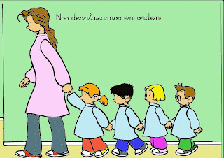 entrar y salir todos en fila del aula preparándonos para salir en la pared